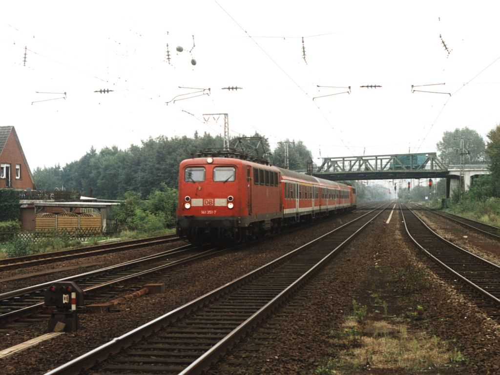 141 420-0 hat die Spitze der Steuerwagen angekuppelt (?!) und fahrt als Regionalbahn mit Regionalbahn Emden-Münster bei Hauenhorst am 19-07-1996. Bild und scan: Date Jan de Vries.