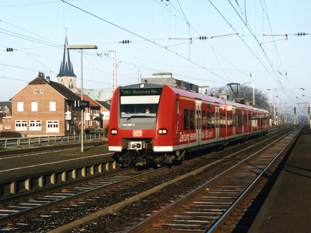 BR 425 ist hier der Nachfolger der BR 141 mit Wendezüge, aber heute gibt es auch keine DB und BR 425 mehr auf diese Strecke! Hier ist 425 588-3/435 508-1/435/425 488-1 mit RB 61 "Wiehengebirgs-Bahn" 12411 Bad Bentheim-Bielefeld unterwegs auf Bahnhof Salzbergen am 25-02-2003. Bild und scan: Date Jan de Vries.