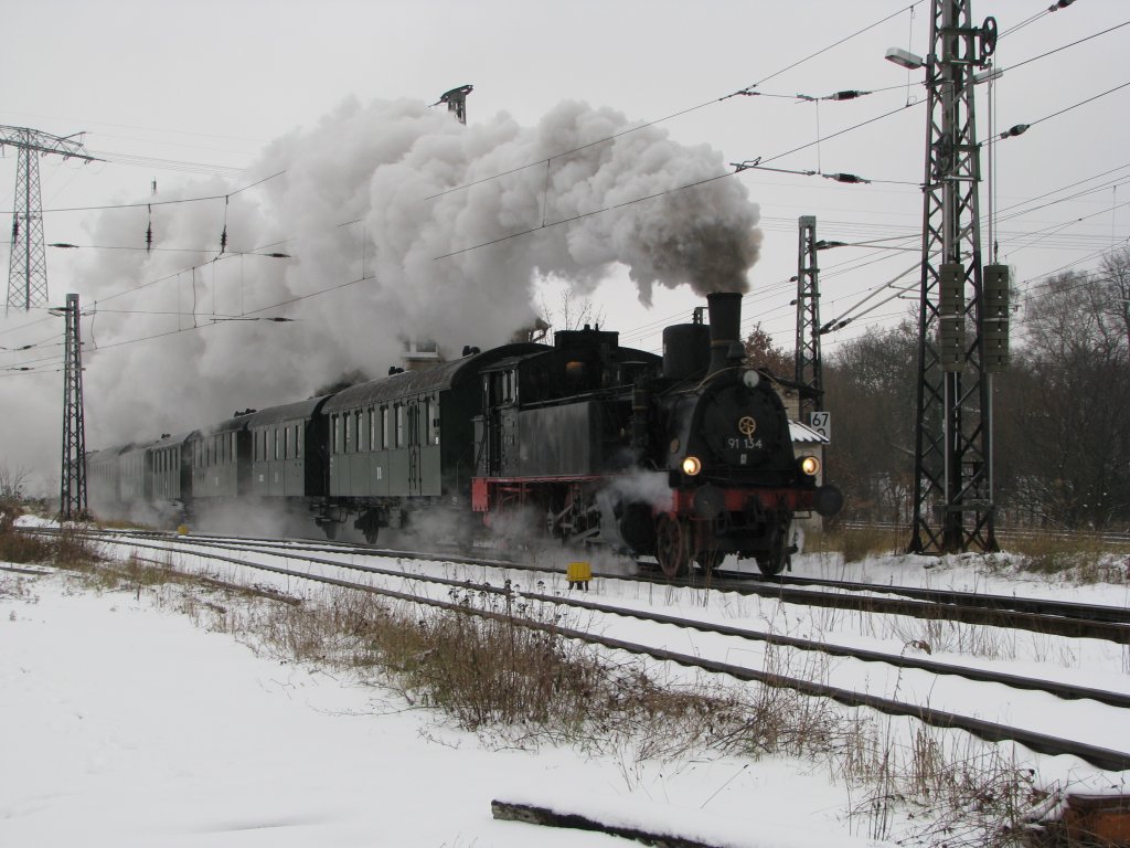 Dampflok 91 134 fährt mit ihrem Sonderzug aus Groß Brütz in den Bahnhof von Schwerin Hbf ein 05.12.2010