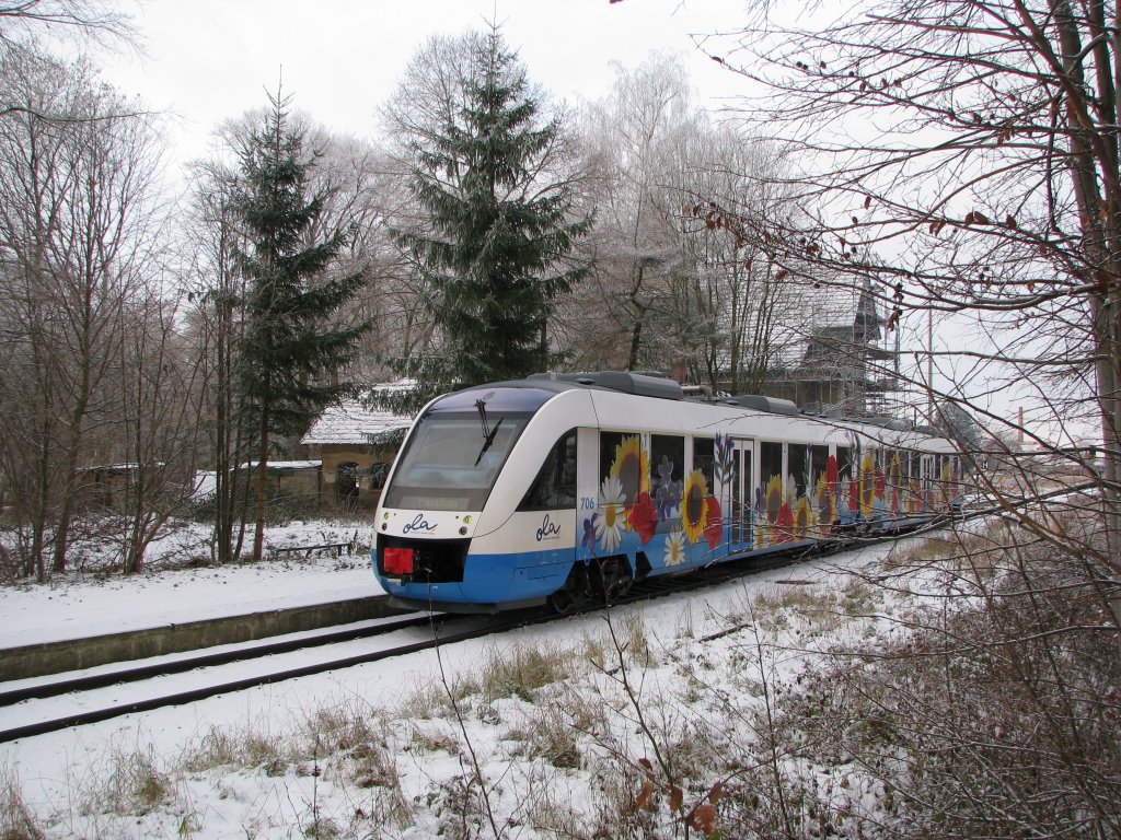 TW 706 der Ostseeland Verkehr GmbH wartet im Bahnhof von Gadebusch auf Fahrgäste in Richtung Schwerin Hbf am 09.12.2010