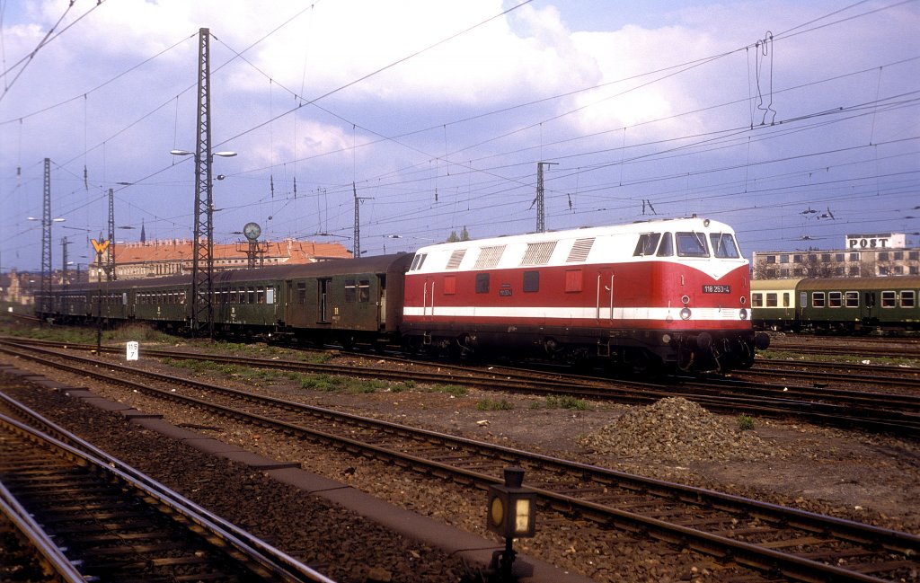 Gera Hbf im Jahr 2008, die Trennung der Bahnanlagen des eh. Bf's Gera (Reuß) Pr. Stb., zwischen KPEV und K.Sächs.Sts.E.B., sind noch heute sichtbar, die 4 eh preuß. Bahnsteiggleise sind mit einer repräsentativen Bahnsteighalle überdacht. Am 17.04.2008 wartet am Bst. 3a RE3654 nach Göttingen, gebildet aus 3x 612 (684/184+029/529+673/173).