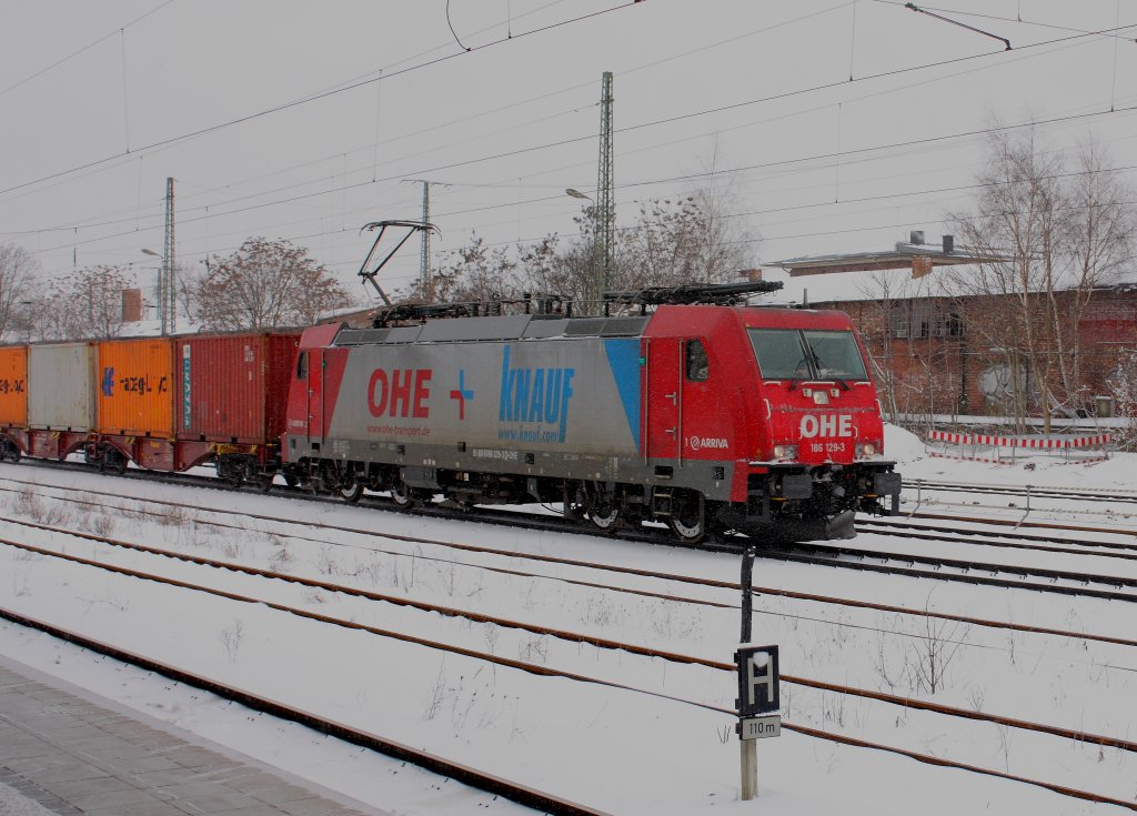186 129-3 der Osthannoverschen Eisenbahnen AG (OHE) mit einem Containerganzzug in Magdeburg Hbf. Fotografiert am 12.02.2010.