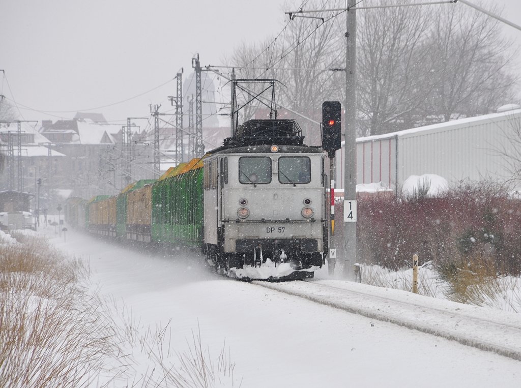 DP 57 mit PBSV-Schieber verlässt mit einem Holzzug den Bf Stralsund Richtung Rostock am 16.02.2010