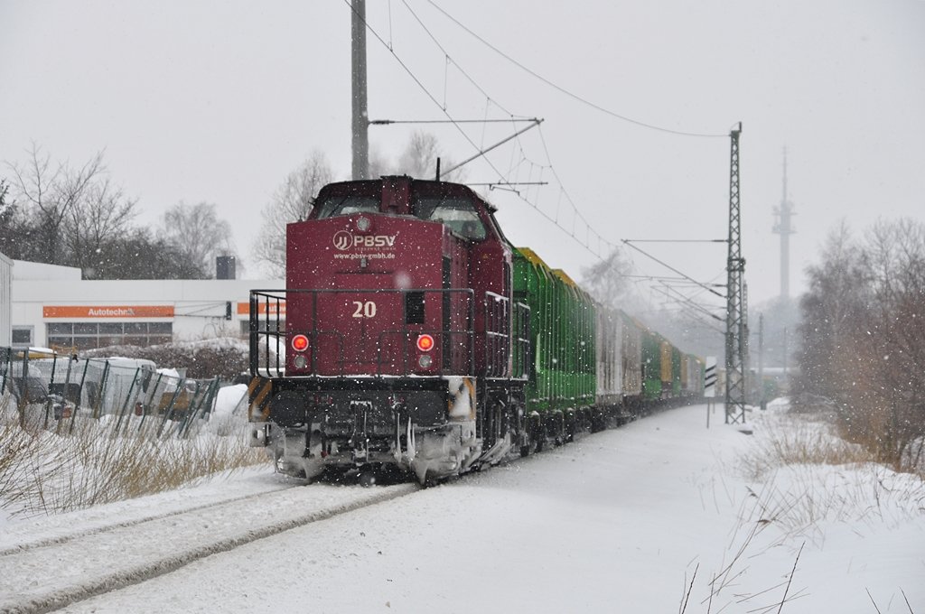 PBSV 20 als Schieber am Holzzug aus dem Bf Stralsund Richtung Rostock am 16.02.2010 DP 57 hat die Führung