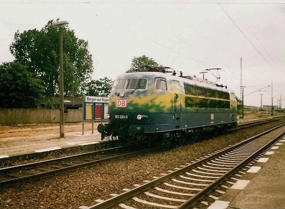 Als der Urlaubsexpress aus Köln im Juni 1998 erstmalig nach Rügen kam endete Dieser bereits in der Inselhauptstadt Bergen.Hier mußte jedesmal die 103 220 wieder an das andere Zugende umsetzten.An einem Junitag 1998 fotografierte ich Sie beim umsetzten in Bergen.