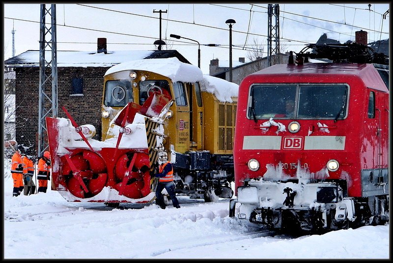 Die 120 154 will auch mit auf`s Bild. Schneeschleuder 40 80 947 5 155-4 wurde inzwischen gedreht. Stralsund am 13.02.10