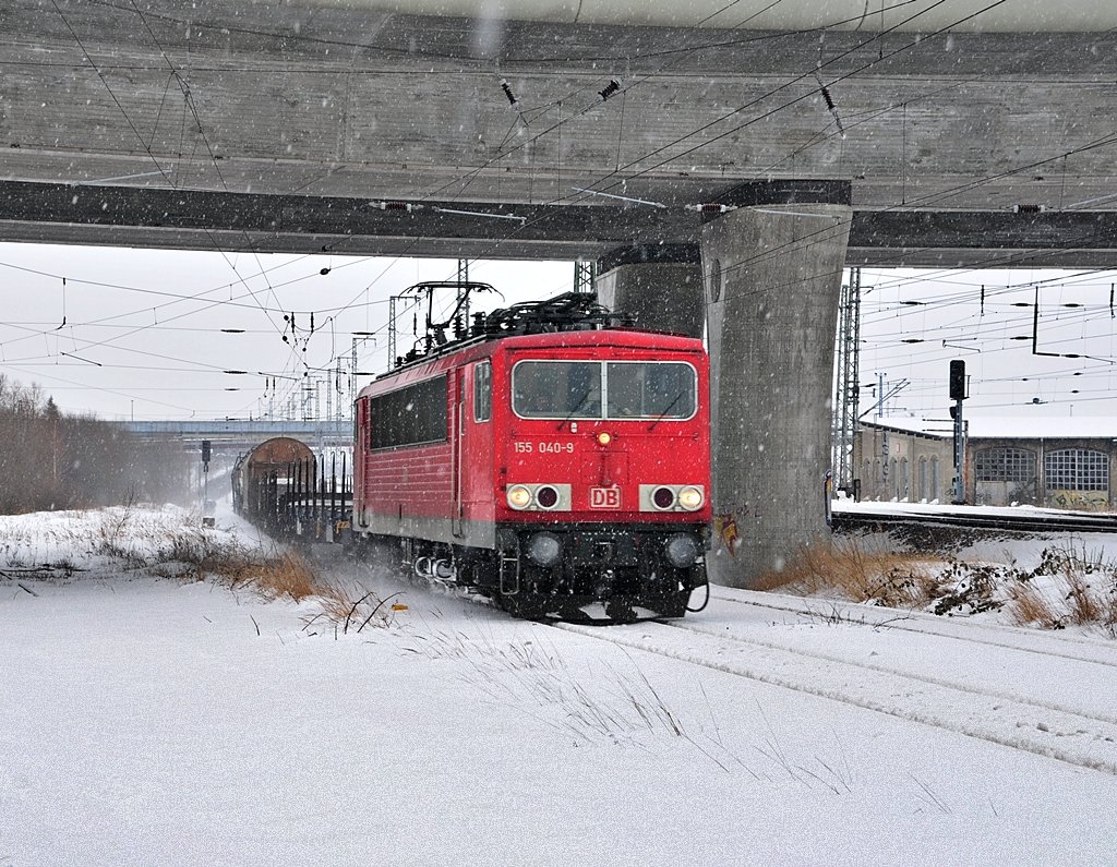 155 040 kommt am 09.02.2010 von Mukran kurz vor dem Bf Stralsund