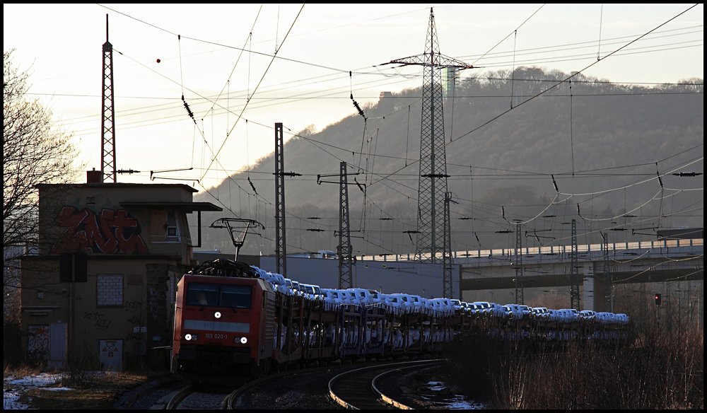 Modellbahngerechter AUDI-Express: 189 020 (9180 6189 020-1 D-DB) hat diesen kurzen "AUDI-Express", Ingolstadt Nord - Emden, am Haken und durchfährt Westhofen in Richtung Küste. Am Haken sind 15 Autotransportwagen beladen mit fabrikneuen A4, A5, A6 und S5. (18.02.2010)