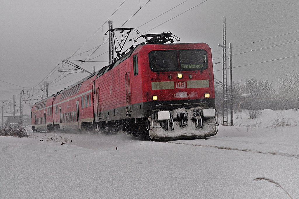 112 106 auf dem Weg von Stralsund nach Sternberg mit ihrer Kurz-RE bei wieder mal winterlichem Wetter am 18.02.2010