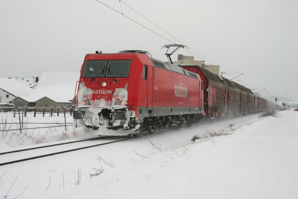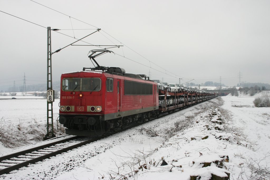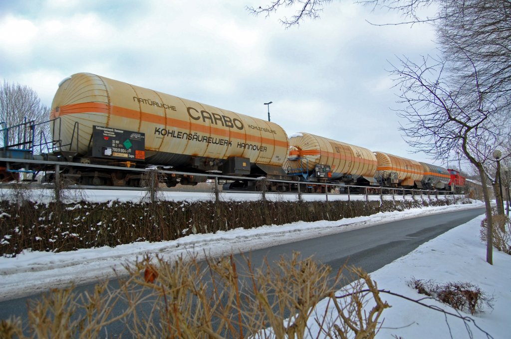 155 004-5 ist mit Kesselwagen am 19.02.2010 bei Serwest in Richtung Berlin unterwegs