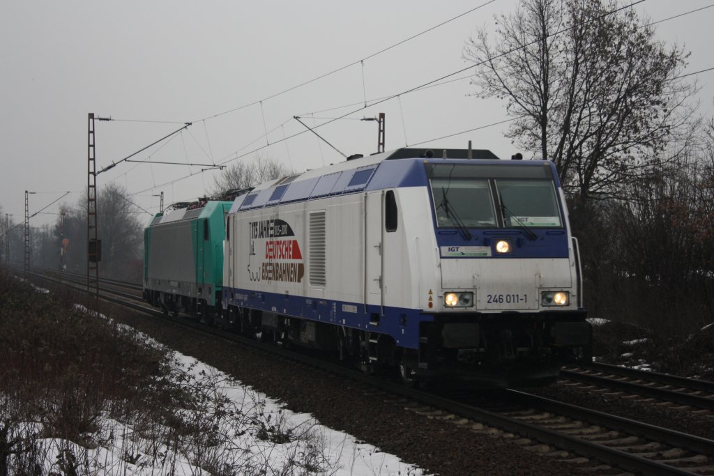246 011 und 186 251 rollen am 06.02.2010 zusammen durch Hannover Limmer.