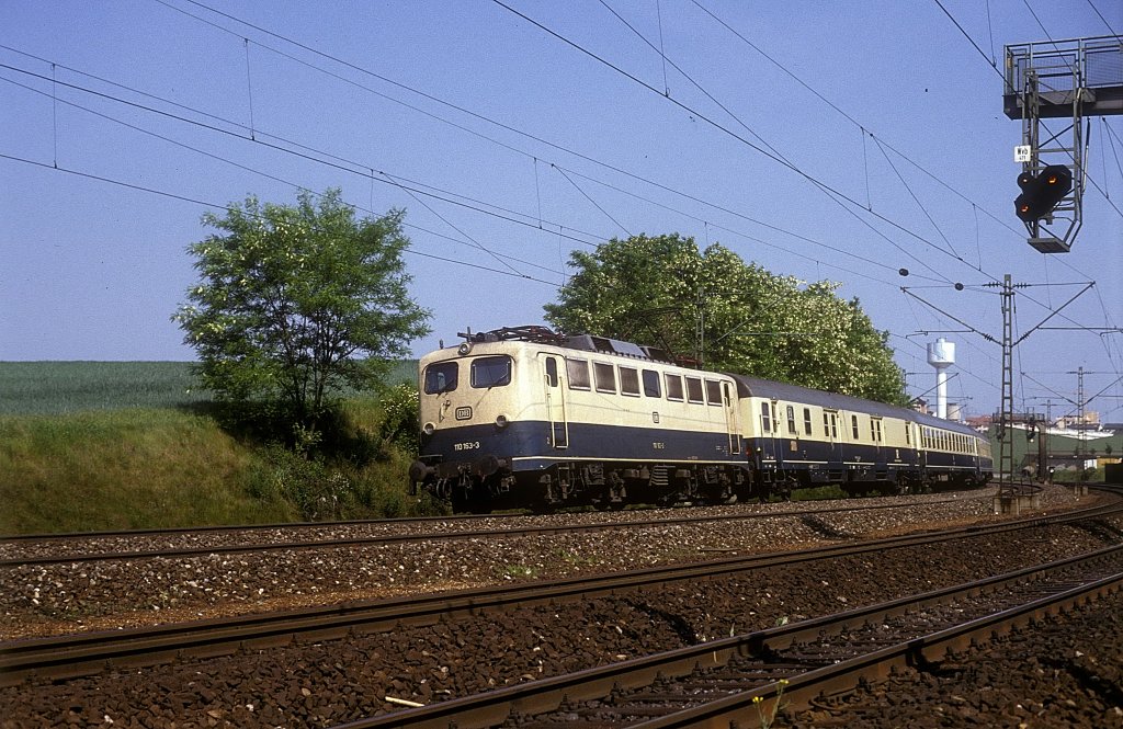 01 1100 mit D-Zug aus den 1960er Jahren auf der Fahrzeugparade "Vom Adler bis in die Gegenwart", die im September 1985 an mehreren Wochenenden in Nürnberg-Langwasser zum 150jährigen Jubiläum der Eisenbahn in Deutschland stattgefunden hat.