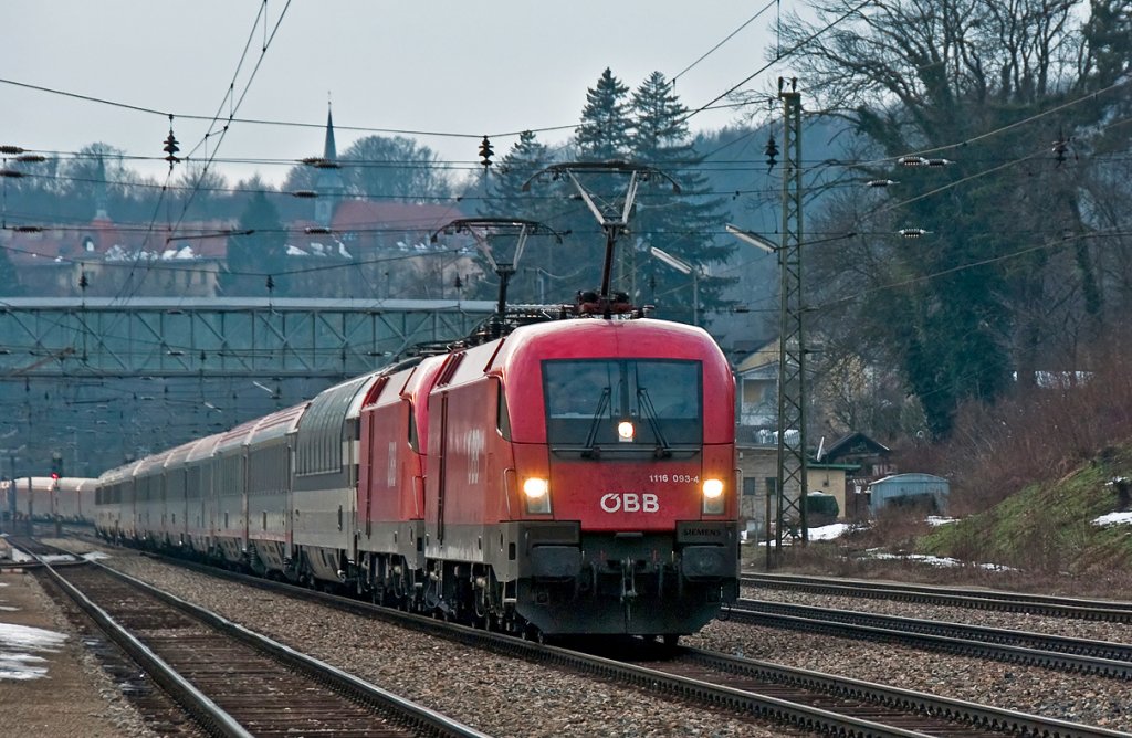 1116 093 an der Spitze des OEC 163  Transalpin  (Zürich - Wien Westbf.) am 22.02.2010 in Tullnerbach-Pressbaum.