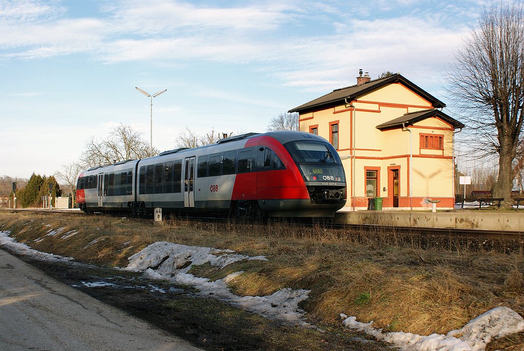 Da die Nachschiebelok in Rekawinkel vom Zug genommen wurde, ergab sich dort ein etwas längerer Aufenthalt. Dies war für mich ausreichend, um den Zug zu überholen. So konnte ich ihn noch einmal in Hofstatt erlegen; GAG 47190, 20.2.2010.
