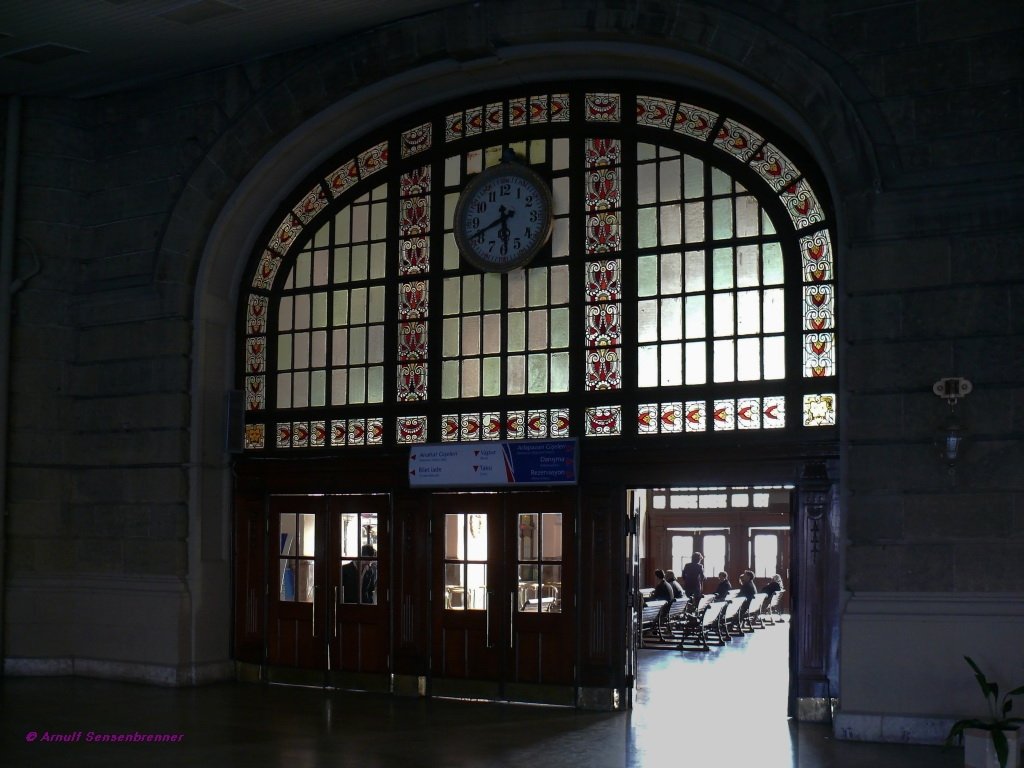 Der Kopfbahnhof Haydarpascha (Haydarpaşa) ist Endpunkt der Eisenbahnen aus Anatolien. Er wurde von 1906-1908 nach Plänen der Architekten Otto Ritter und Helmuth Conu im Stil der deutschen Neo-Renaissance gebaut. Er verfügt u.a. über sehr eindrückliche Bleiglasfenster. Hier ein Blick von der Bahnsteighalle zur Schalterhalle. 11.04.09