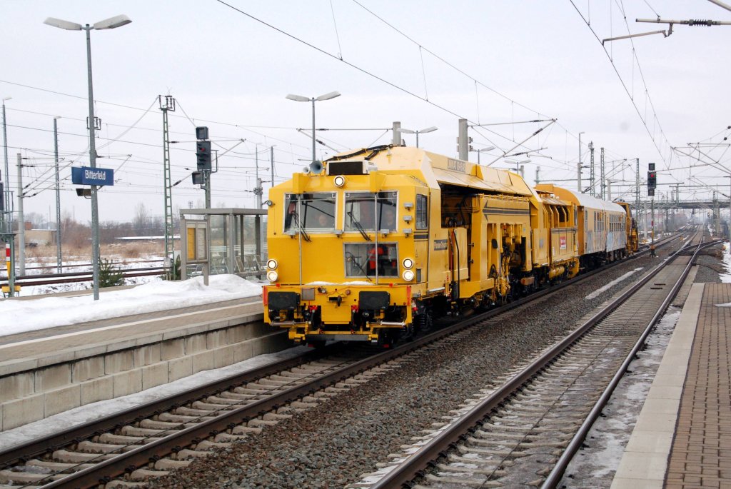Dieser Bauzug bestehend aus Stopfmaschine, zwei Bauwagen und Schotterprofiliermaschine durchfahren am 18.02.10 Bitterfeld Richtung Leipzig.