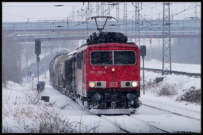 ...und wieder eine Schneeeinfahrt. 155 097-9 vor einem Güterzug aus Mukran, fährt in den Hbf Stralsund ein. am 11.02.10