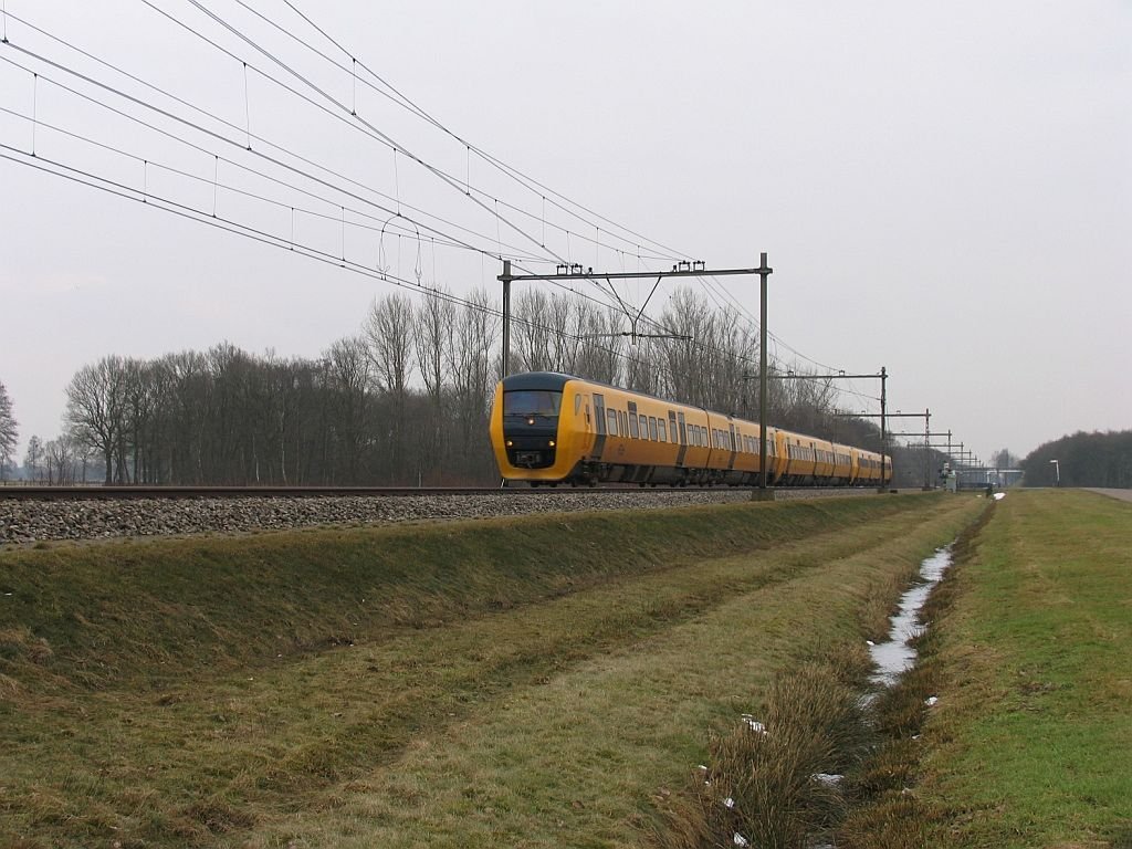 Am frühen Morgen fahren Koplopers 4041, 4227 und 4228 vorbei unter eine graue Himmel mit IC 728 Groningen CS-Schiphol bei Haren am 19-2-2010.