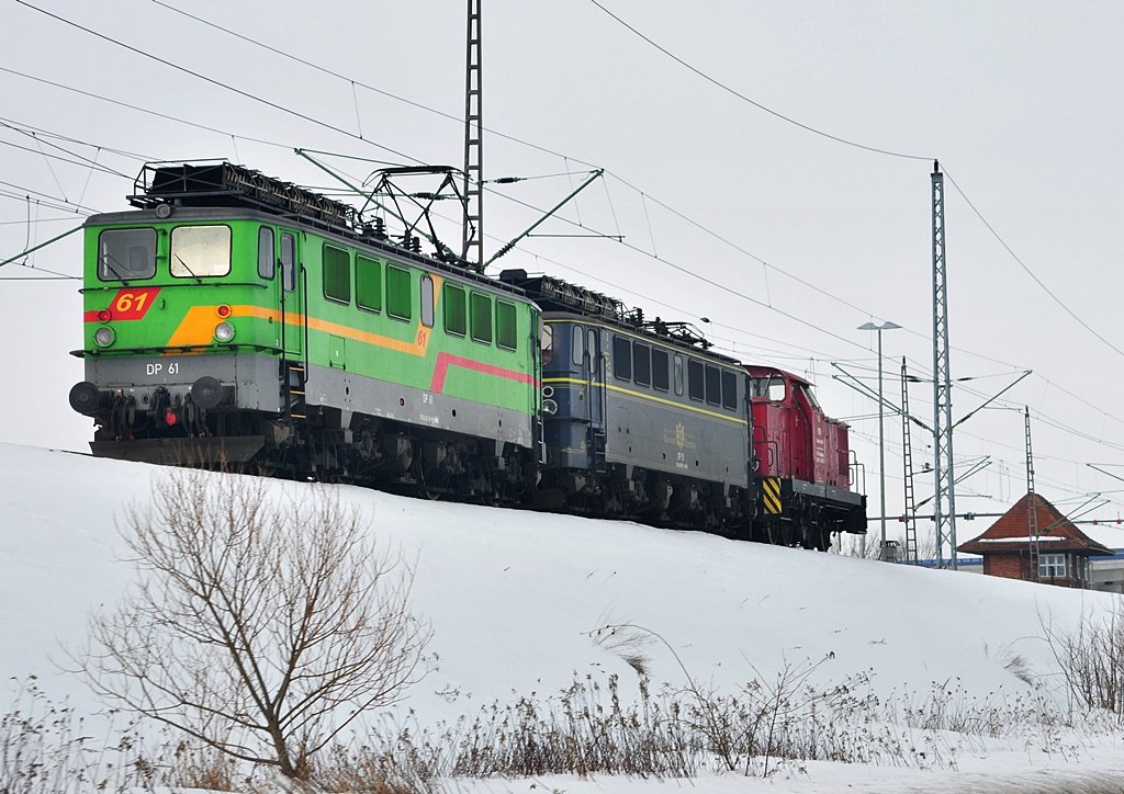 Lok 6 der PBSV bringt den Krankentransport(DP51) aus Grimmen mit der Schlußlok und anschließender Zuglok DP 61 in den Bf Stralsund-Rügendamm am 22.02.2010