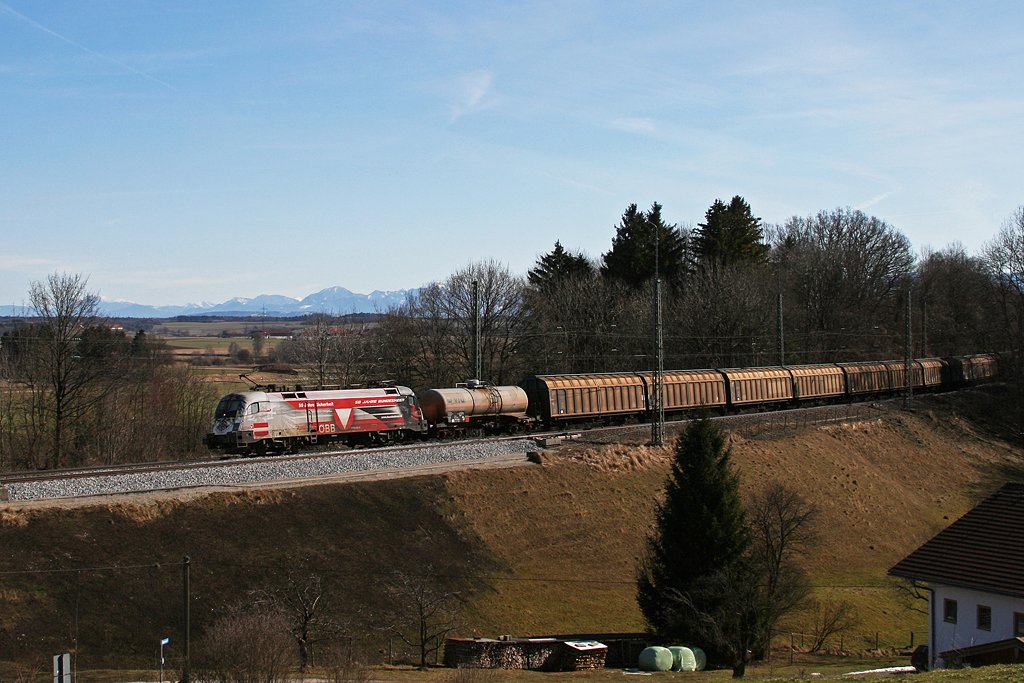 1116 246 mit einem gemischten Güterzug am 27.02.2010 in Aßling.