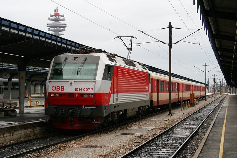 11.8.07 Im Jahr 2007 noch ein Alltagsgesicht, heute schon am Abstellgleis. Gerade einmal 2 1/2 Jahre ist es her als die Baureihe 1014 noch mit Schlieren zwischen Wien und Ungarn gependelt ist. Heute leider nur noch auf Bildern zu bewundern. Hier fährt die 1014 007 gerade mit dem ER 9432 von Tatabanya am Zugendbahnhof: Wien Südbahnhof Ostseite ein.