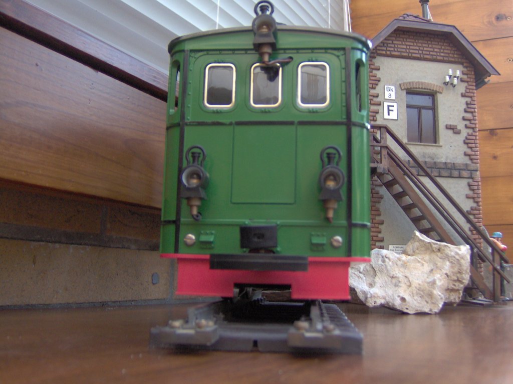 Die Tramdampflok No102 oder auch "Feuriger Elias" wartet am Stellwerk auf grünes Signal.Hierbei handelt es sich um eine Tramdampflok von LGB.