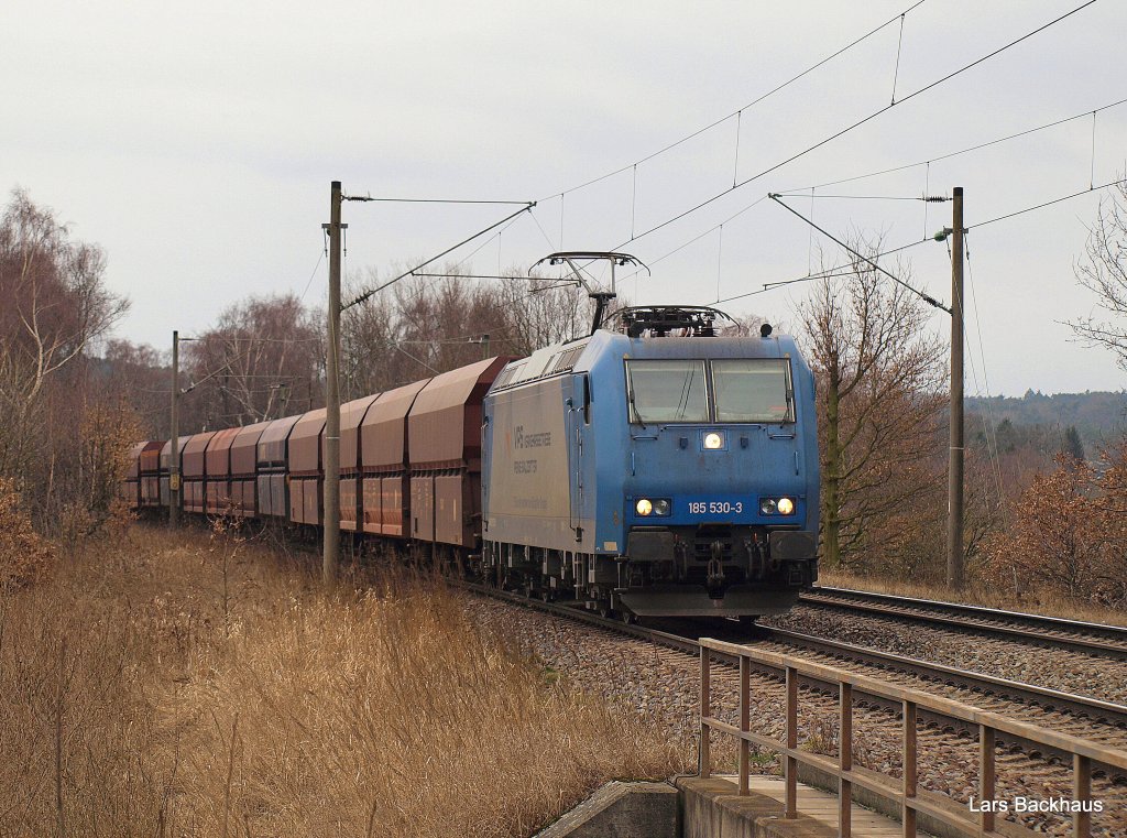 Schwere Last am Haken hat am 27.02.10 die 185 530-3 der VPS, die hier mit einem Erzleerpark durch Hamburg-Moorburg zum Hansaport im hamburger Hafen fährt.