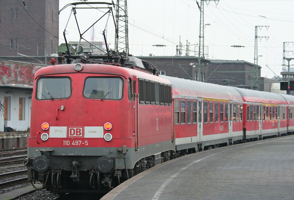 Die 110 497-5 schiebt ihren RE4 Verstärker in Düsseldorf am 05.02.2010