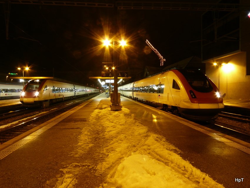 SBB  - ICN Willi Ritschard und Blaise Cendrans am Morgen im Bahnhof Biel am 16.01.2010 .. 06:35:59, Belichtungsdauer: 2.500 s (25/10), Blende: f/6.3, ISO: 100, Brennweite: 4.60 (46/10) .. Ohne Blitzlicht ..
