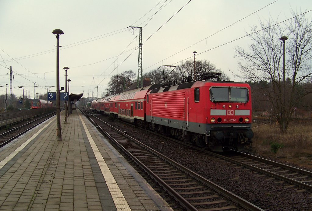 143 821-7 beschleunigt hier gerade aus dem Bahnhof in Calau/Niederlausitz. Seine Reise führt ihn mit der RB14 nach Nauen über Berlin Schönefeld Flughafen. 29.12.2009