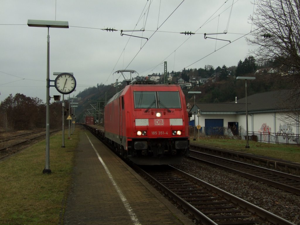 185 351-4 mit einem sehr leeren KLV-Zug bei der Durchfahrt von Vallendar/Rhein.24.12.09