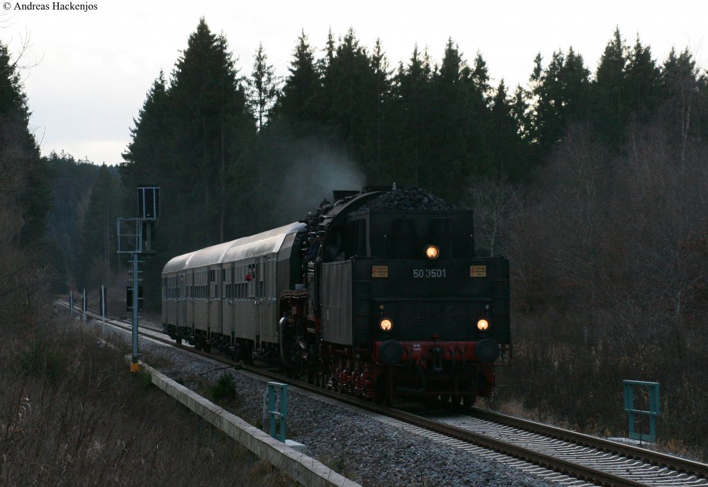 Die Rückfahrt 65 1049 nach Chemnitz am 20.12.09 führte über BSg mit kurzem Zwischenstop im Bahnhof Schlettau. Wegen der klirrenten Kälte wurde, um den Fahrplan einzuhalten, der Halt etwas gekürtzt. Nach ergänzen der Wasservoräte durch der örtlichen Feuerwehr ging es dann weiter über Schwazenberg und Aue nach Chemnitz. Hier verlässt der Sonderzug den Bahnhof Markersbach.