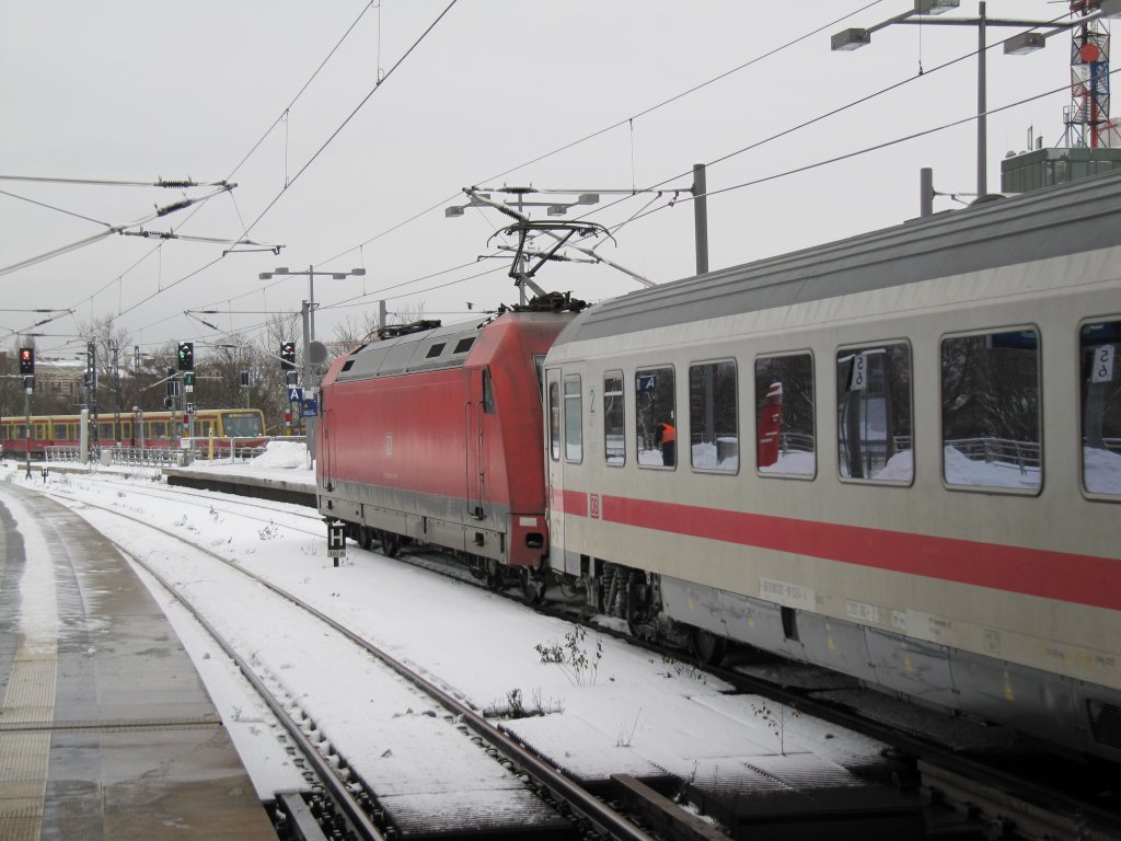 101 006-5 mit dem etwas verspäteten EC 341 nach Kraków Główny im verschneiten Karlshorst am 1.1.2010