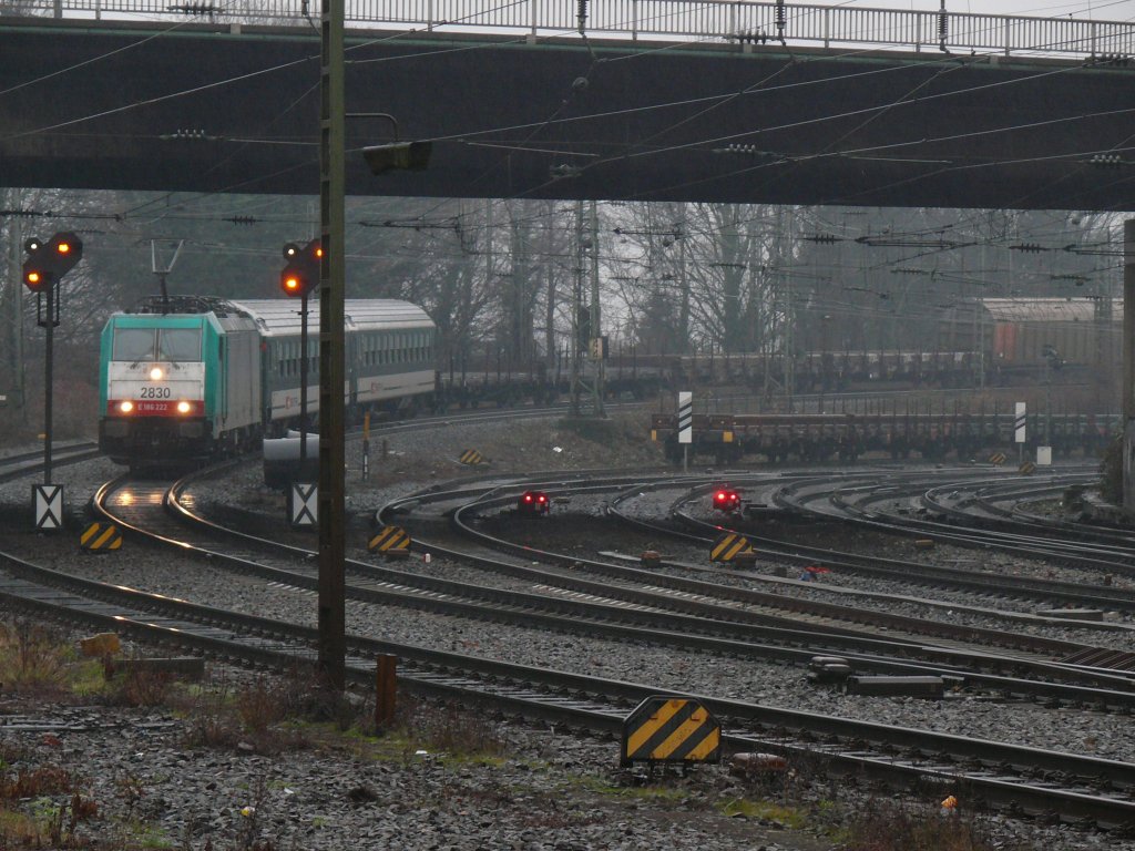 Cobra-Lok 2830 kommt hier mit einem Güterzug nach Aachen-West. Hinter der Lok hängen zwei Bpm 51 Personenwagen. Aufgenommen am 29/12/2009.