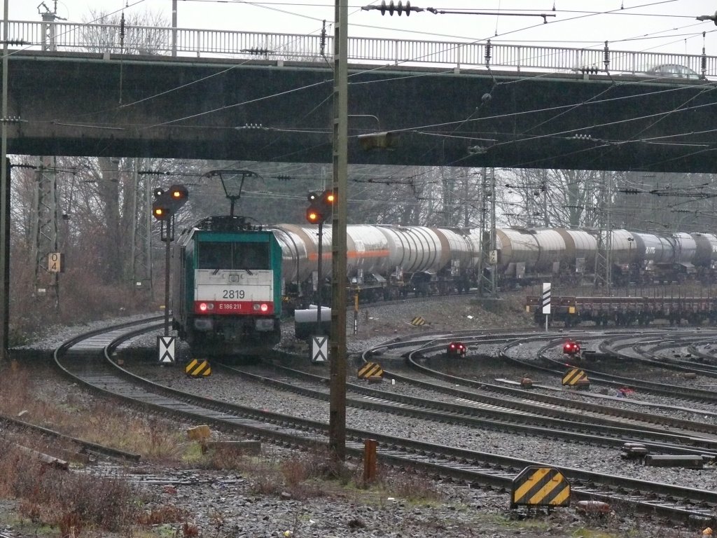 Der Schein trügt. Cobra-Lok 2819 kommt nicht etwa in Aachen-West an, sondern gibt ihrer Schwester 2813 Schubhilfe (auch zu erkennen an den roten Schlusslichtern)in der steilen Rampe Richtung Gemmenicher Tunnel. Aufgenommen am 29/12/2009.