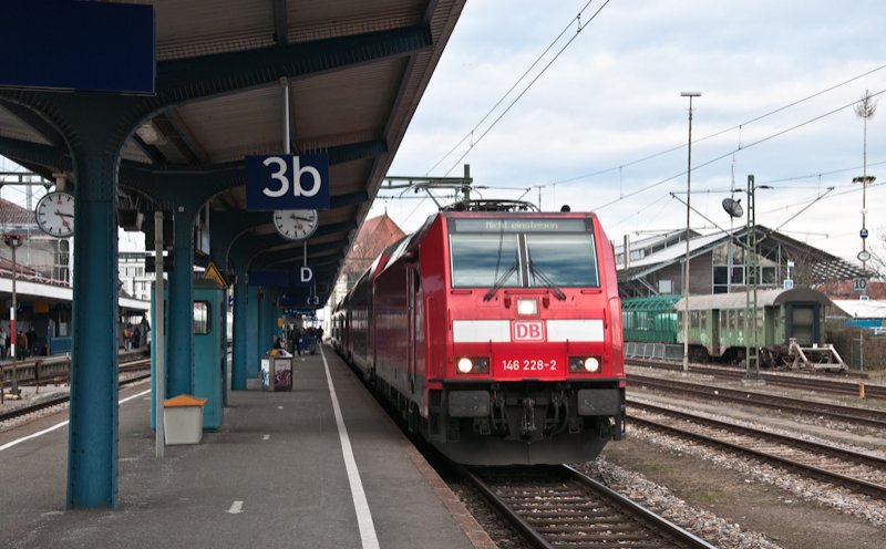 Die  neue alte  auf der Schwarzwaldbahn: 146 228 fuhr schon einmal auf der KBS 720: Die ehemalige Freiburgerin wurde 2007 nach Nürnberg abgegeben. Nun herrscht jedoch wieder Bedarf nach einer weiteren Lok, so dass sie seit dem Fahrplahnwechsel wieder zwischen Konstanz und Karlsruhe ihre Runden dreht.