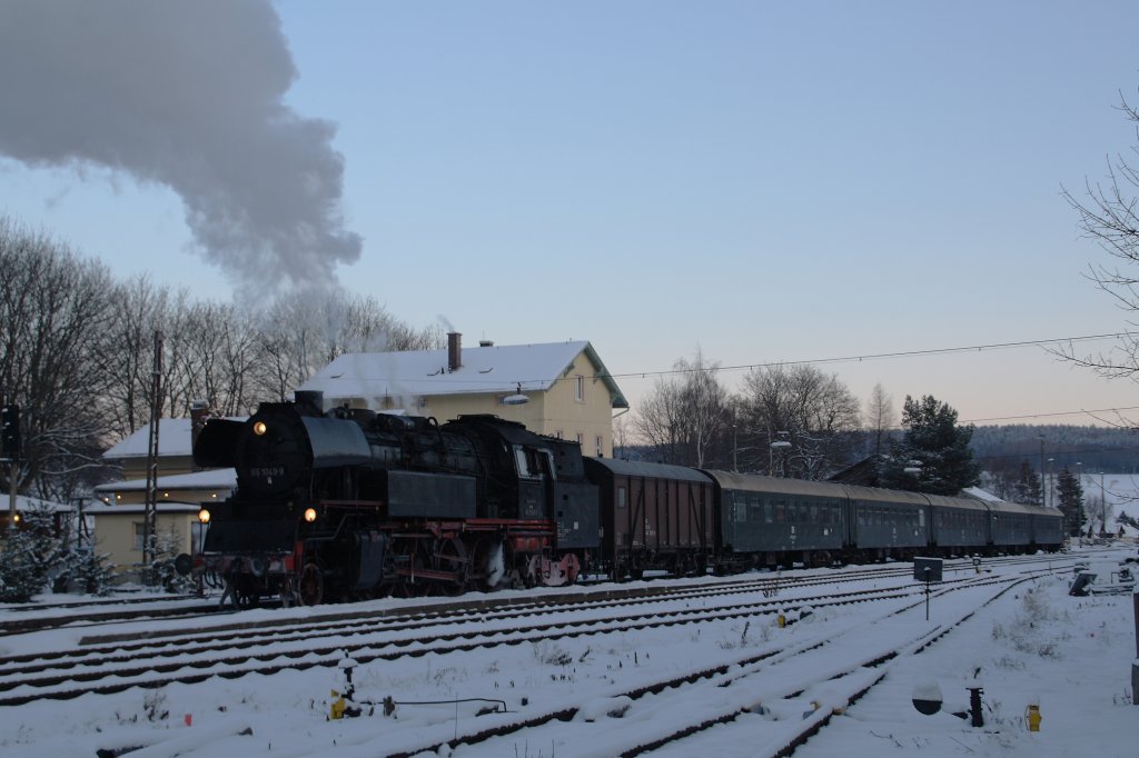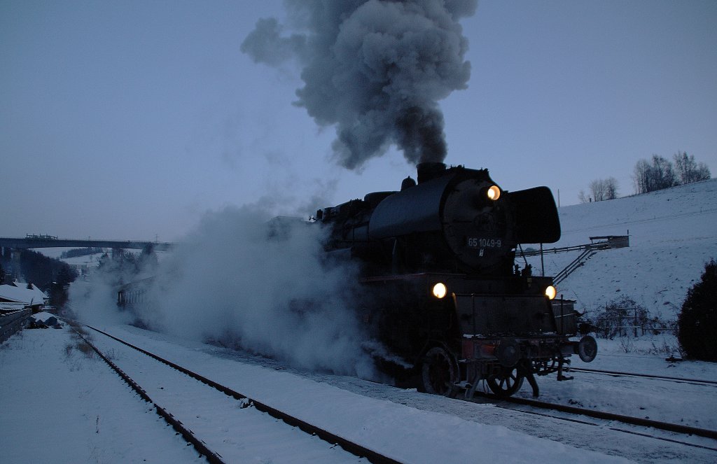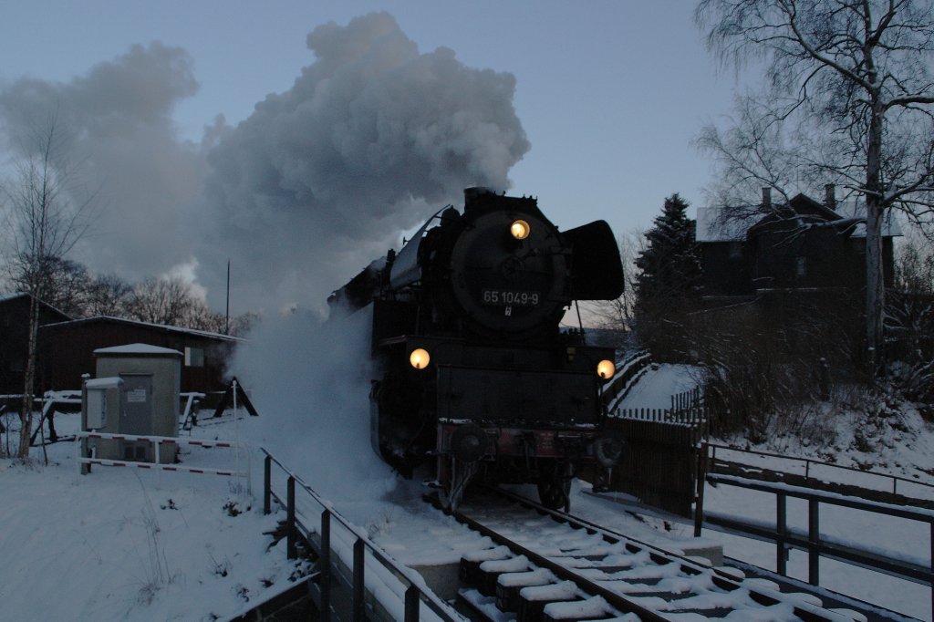 Die Rückfahrt 65 1049 nach Chemnitz am 20.12.09 führte über BSg mit kurzem Zwischenstop im Bahnhof Schlettau. Wegen der klirrenten Kälte wurde, um den Fahrplan einzuhalten, der Halt etwas gekürtzt. Nach ergänzen der Wasservoräte durch der örtlichen Feuerwehr ging es dann weiter über Schwazenberg und Aue nach Chemnitz.