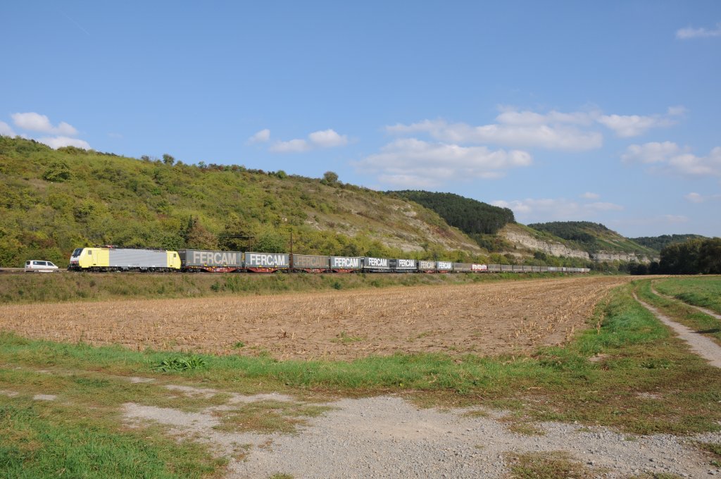 Der Schein trügt. Cobra-Lok 2819 kommt nicht etwa in Aachen-West an, sondern gibt ihrer Schwester 2813 Schubhilfe (auch zu erkennen an den roten Schlusslichtern)in der steilen Rampe Richtung Gemmenicher Tunnel.
