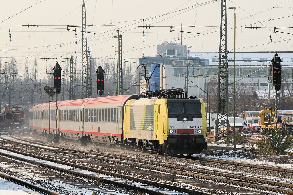 ES64F4-093 am 19.12.09 mit EC 87 nach Verona und +25 bei der Einfahrt München Ost