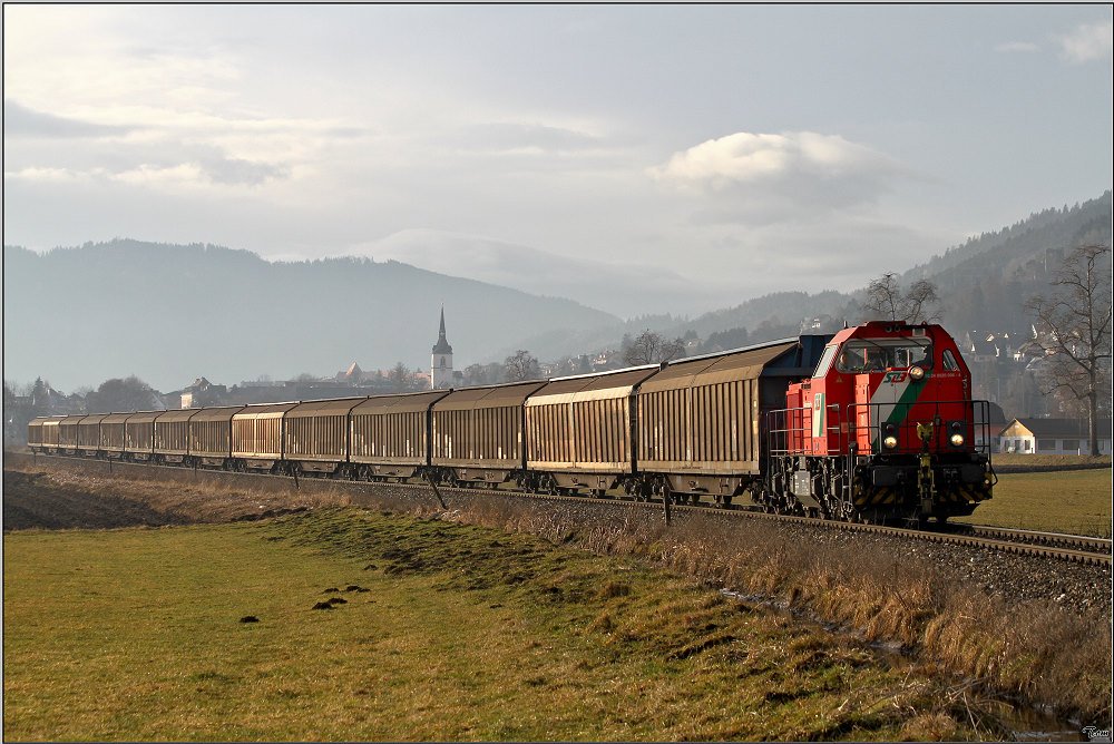 Gmeinder D6 der STLB fährt mit dem Zellstoffzug SGAG 93043 von Pöls nach St.Michael. Fohnsdorf 31.12.2009