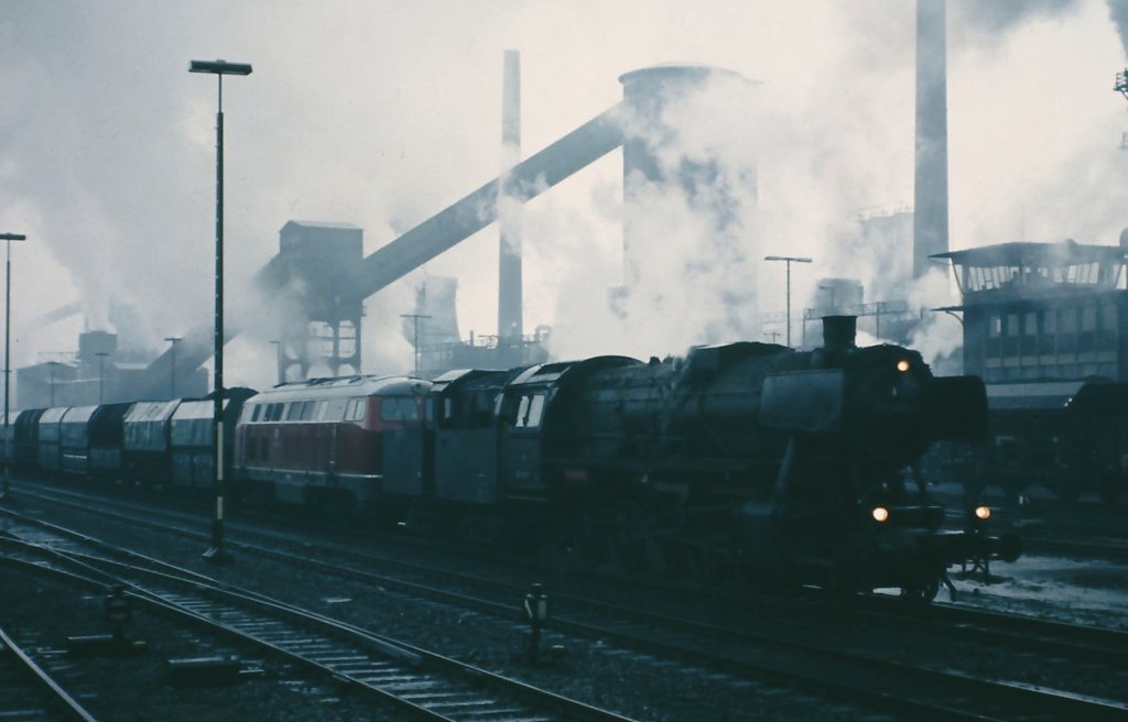 050 805-6 und eine Diesellok der Baureihe 216 dokumentieren den Übergang von der Dampf- zur Dieseltraktion. In der Übergangszeit um 1975 leisteten sie gemeinsame Arbeit in Alsdorf vor der Kulisse des Eschweiler Bergwerksvereins.