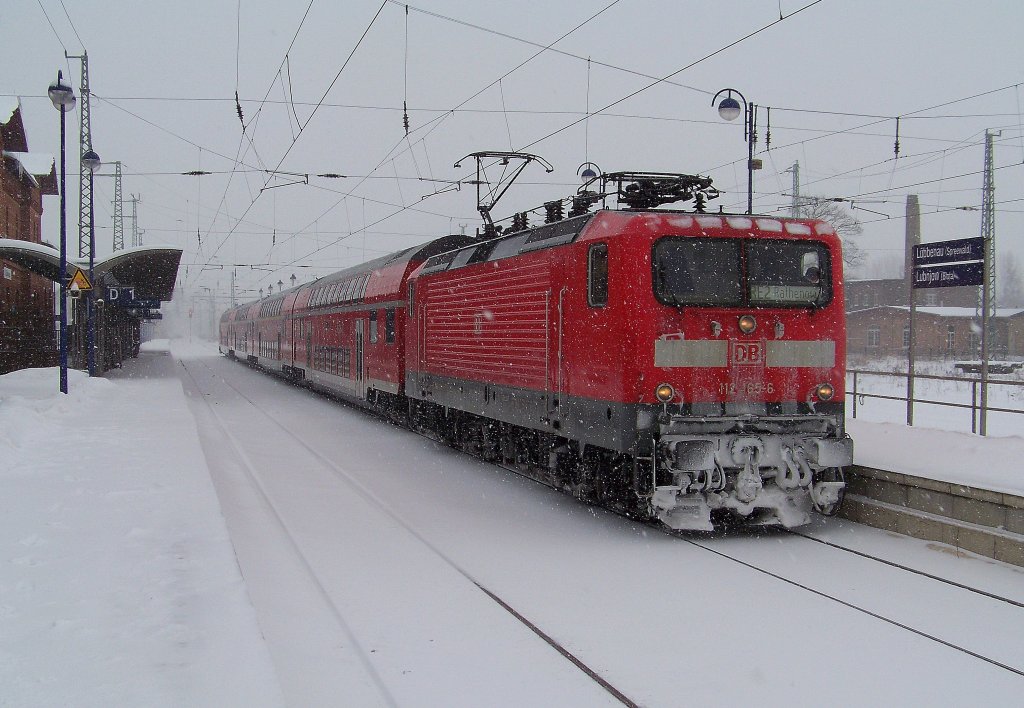 Hier 112 123 mit einem RE3 von Wünsdorf-Waldstadt nach Schwedt/Oder, bei der Ausfahrt am 10.1.2010 aus Angermünde.
