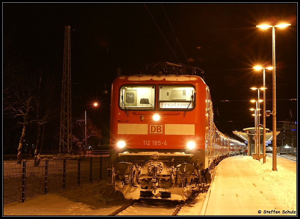 112 185 mit dem Warnemünde-Express nach Berlin am 03.01.10 in Warnemünde.