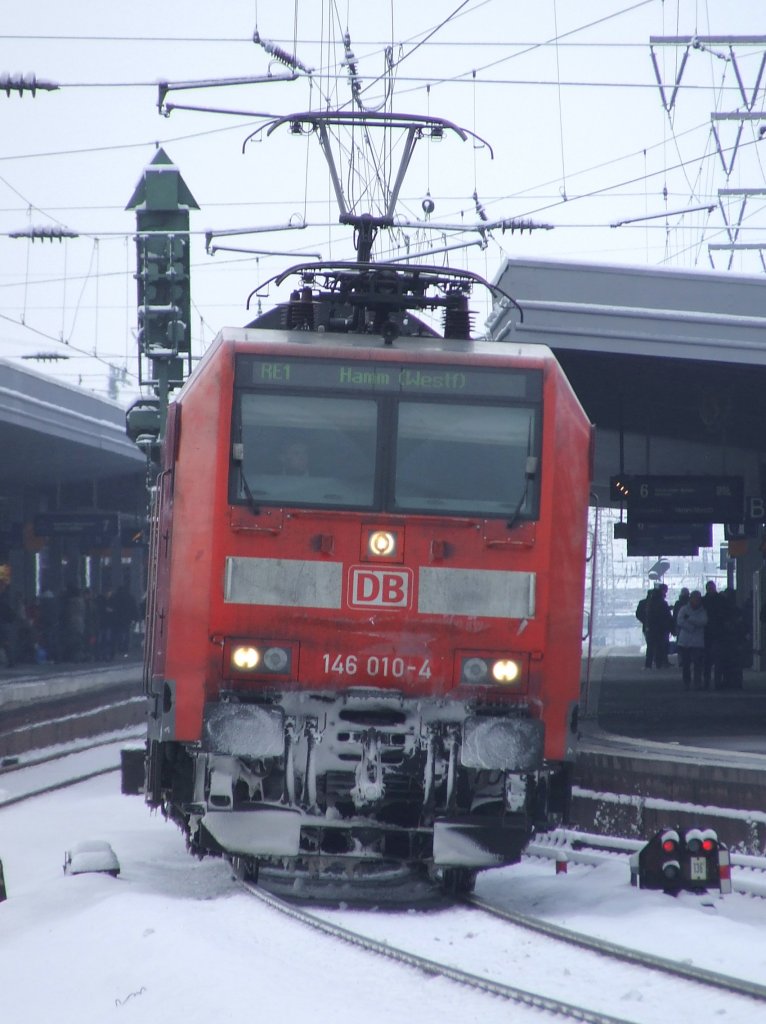 146 010 verlässt am 03.01.2010 den neu gemachten Bahnsteig von Essen Hbf in Richtung Bochum.