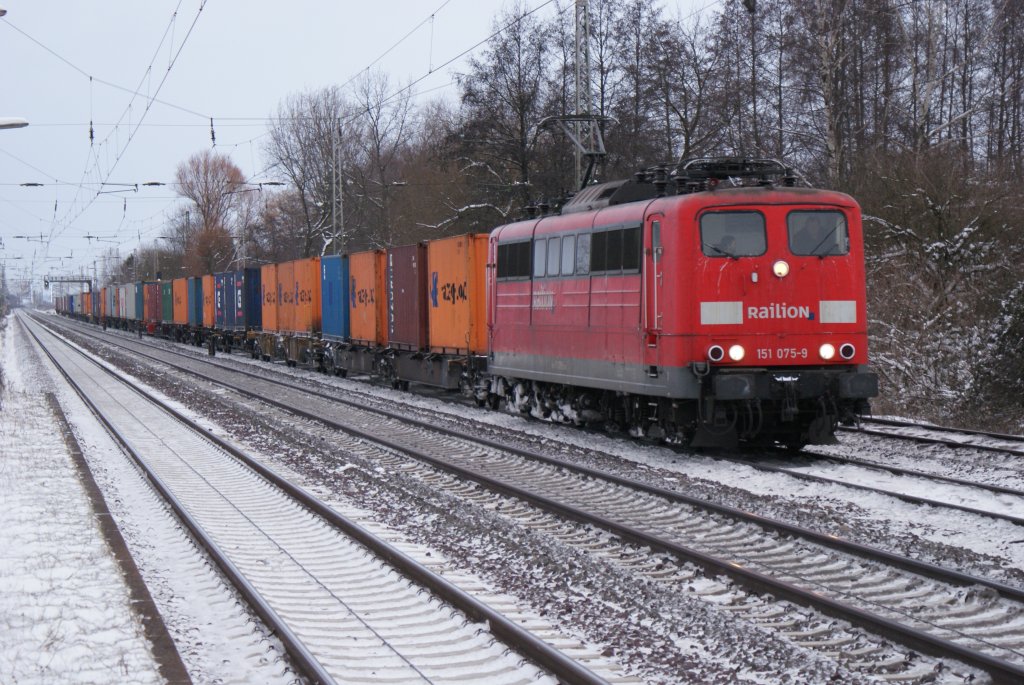 151 075-9 mit einem Containerzug am Haken fuhr am 09.01.2010 durch Dedensen/Gümmer in Richtung Bremen.