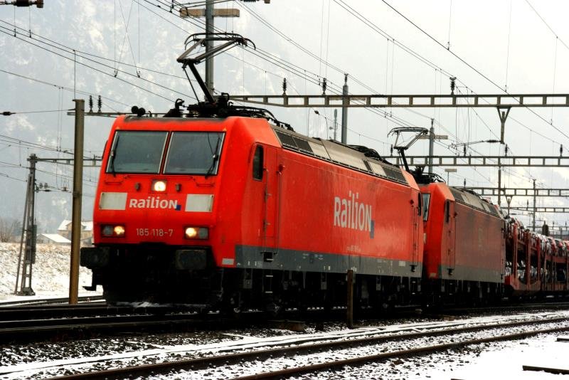 185 118 und 185 113 setzen sich mit einem Autotransportzug, beladen mit Ford-Modellen, in Erstfeld in Bewegung; 08.01.2010