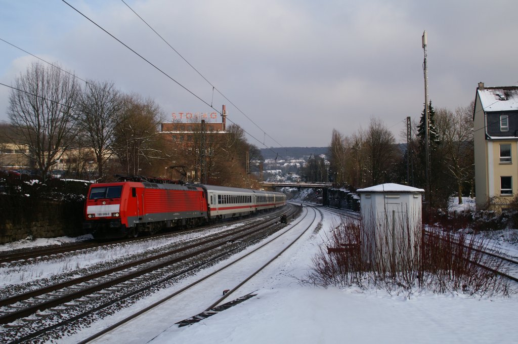 189 049-0 zieht einen mir unbekannten Zug aus vier Wagen durch Wuppertal-Sonnborn in Richtung Wuppertal-Vohwinkel. 08.01.2010 - 14:13