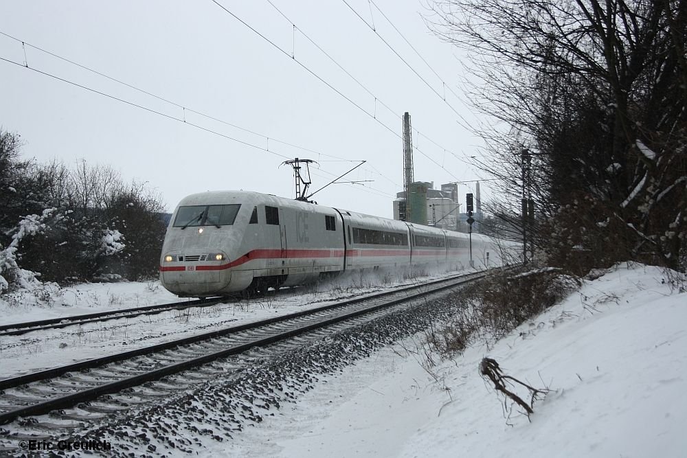 ICE 9554 am 10.01.2010 auf der KBS 670 nach Saarbrücken unterwegs. Hier habe ich den Zug aufgenommen bevor er in Mainzer Bergtunnel in Weidenthal/Pfalz einfahren kann. Der ICE ist noch ca. 1000m von meinem Standpunkt aus entfernt.