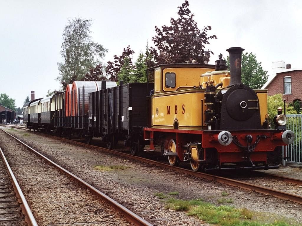 Bellerophon (Vintage Carriages Trust) und Dampflok Nr 2 (MBS) mit Dampfzug 313S Boekelo-Haaksbergen bei Haaksbergen am 1-6-2000. Diese Lok ist auf eine Tiefladeanhänger von Großbritannien nach die Museumsbahn MBS in Haaksbergen gefahren. Die MBS hat nämlich keine Anschluß mit dem Eisenbahnnetz. Bild und scan: Date Jan de Vries.