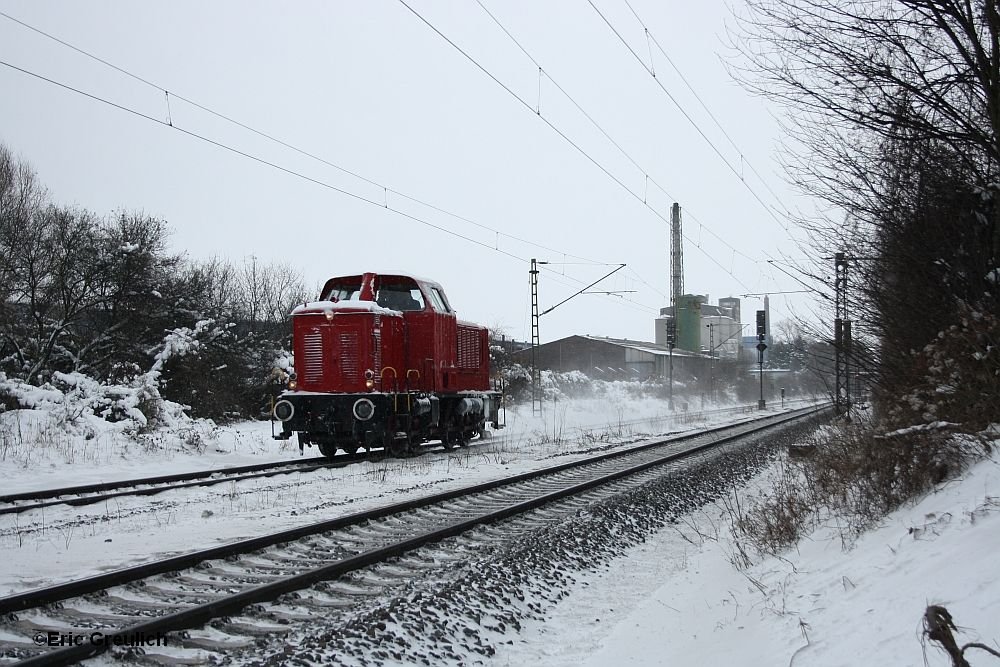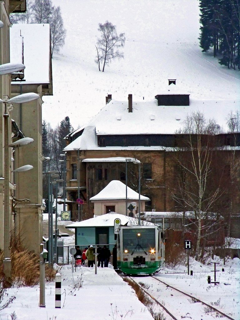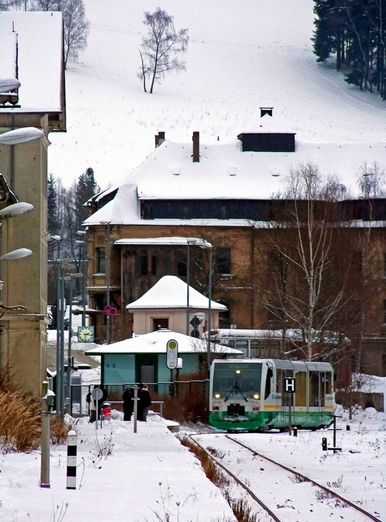 Bahnhof Messe Süd. Der Zug hält genau vor der Brücke und lässt sich hervorragend von oben erwischen. Bei eisigen Temperaturen ist dem Triebkopf ein  Bart  aus Eiszapfen gewachsen :)